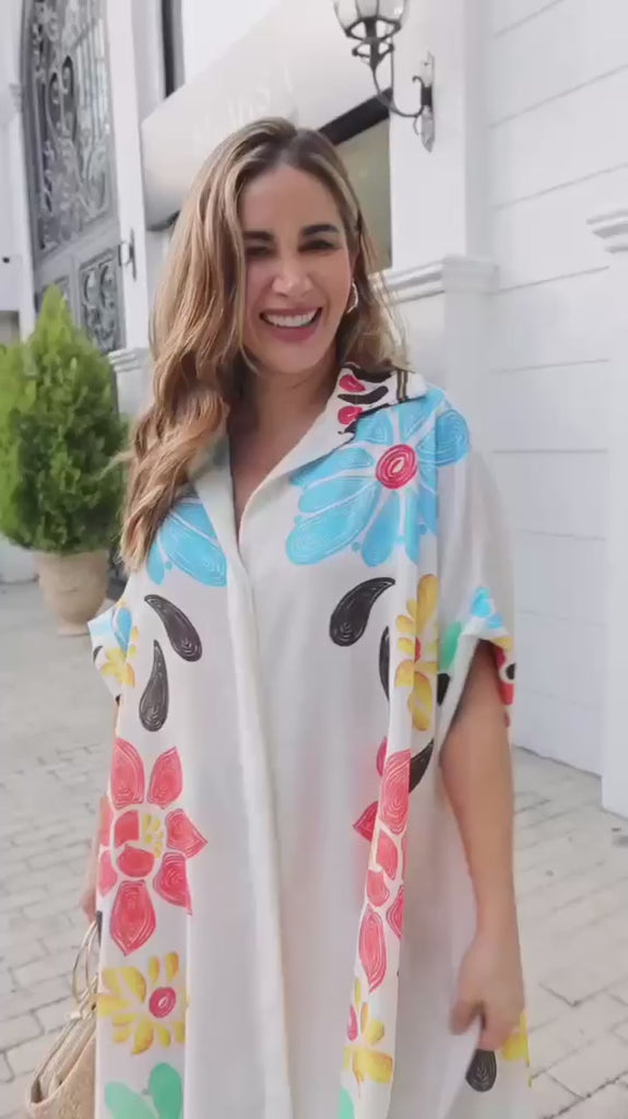 Step into the beauty of spring with our Delicate White Floral Dress, designed to bring a fresh, vibrant touch to your wardrobe. Adorned with a stunning floral print in shades of red, blue, and yellow, this dress exudes a playful yet elegant charm.