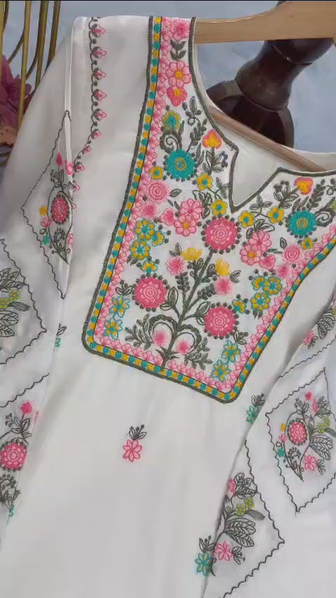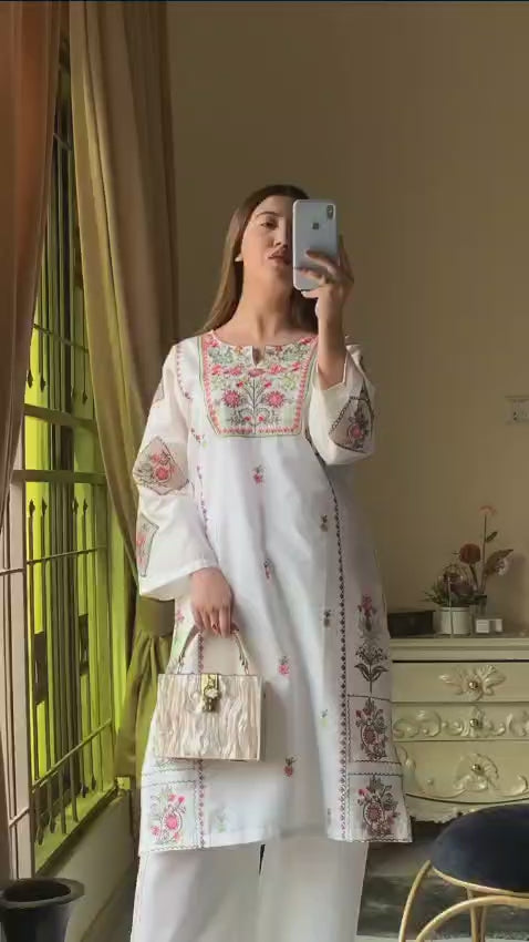 This two-piece set features a beautifully detailed multicolor floral embroidery on a pure white base, combining traditional craftsmanship with modern simplicity. The neckline, sleeves, and pant hems are adorned with vibrant threadwork in shades of pink, green, yellow, and turquoise, giving it a bright yet classy appeal. -